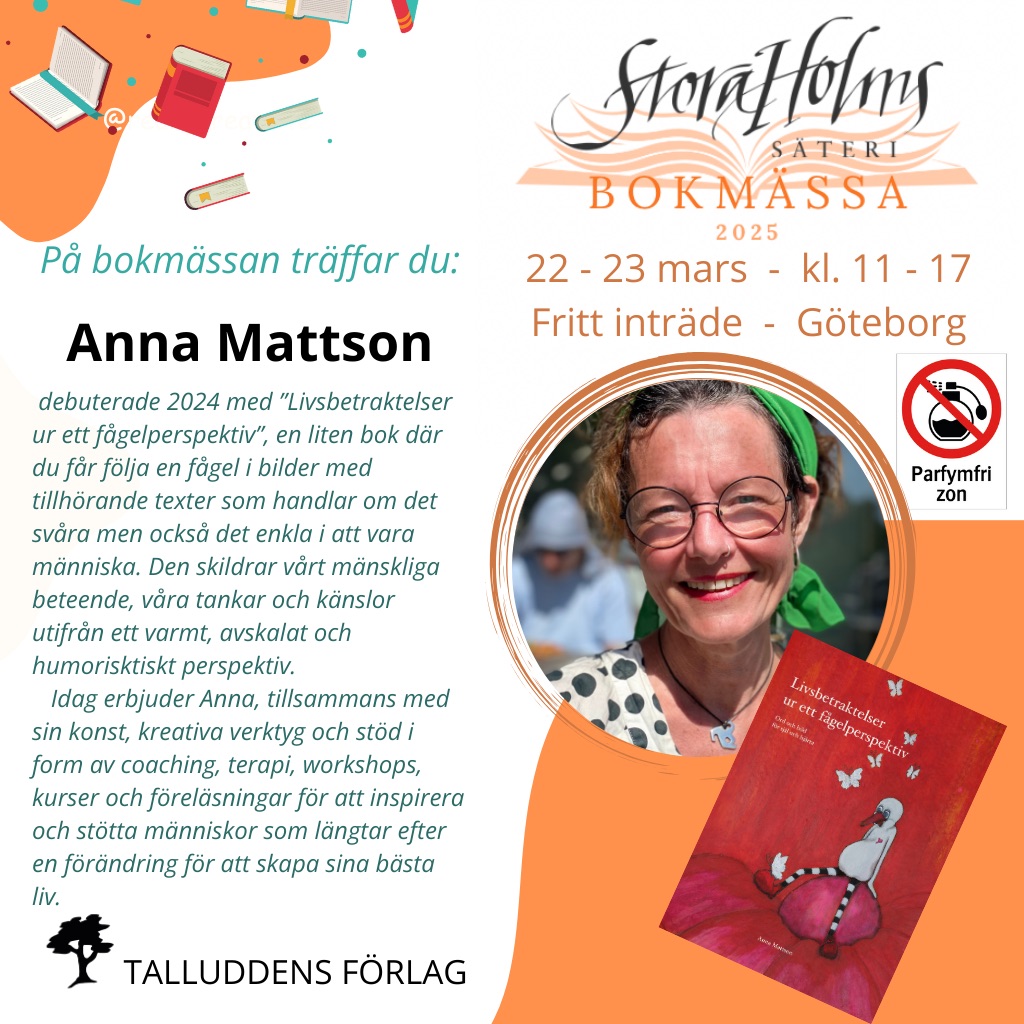 Varmt välkommen till en härlig bokmässa där jag tillsammans med ett 40-tal spännande författare ställer ut min bok och inspirationskortlek ”Livsbetraktelser ur ett fågelperspektiv- ord och bild för själ och hjärta”.